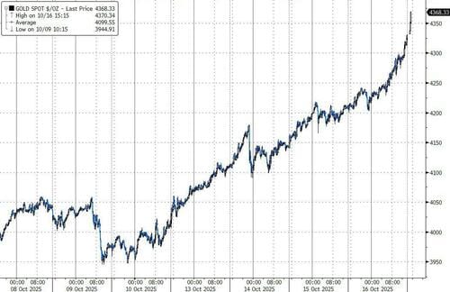 Source: Bloomberg Gold extended gains after the U.S. equity close, surging past $4,370.