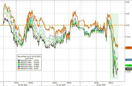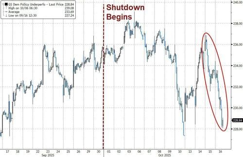 Goldman’s trading desk flagged a perfect storm of drivers behind today’s violent market swings:**Shutdown Drag** We’re now on day 16 of the government shutdown with no resolution in sight—some chatter even suggests it could drag on until Thanksgiving. Goldman’s Democratic Party policy basket is notably underperforming...